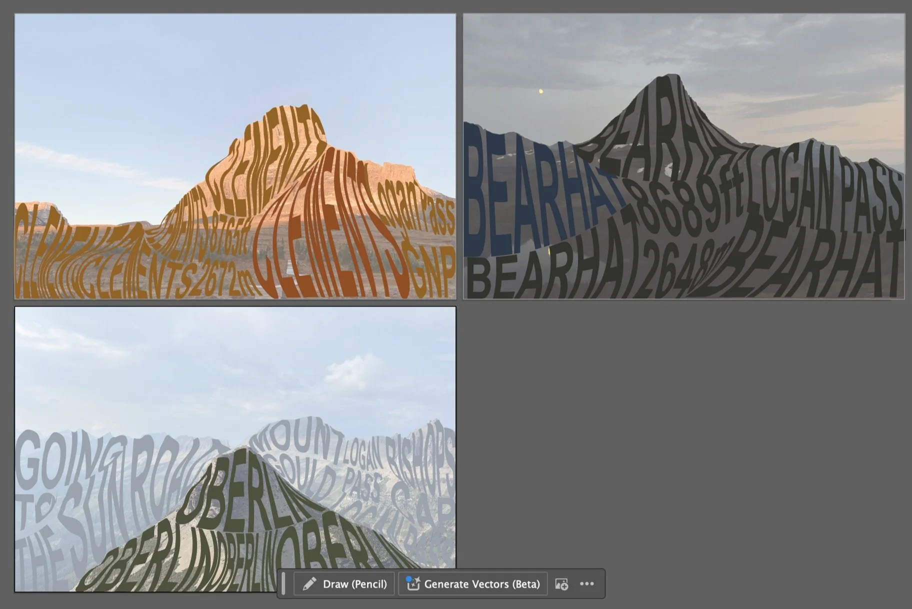 For my typography class, I created a three-piece wall art series using type as illustration. Each piece is based on a photo I took of mountains in Logan Pass, Glacier National Park. I transformed the photos into stylized illustrations made from warped type, exploring how letterforms can convey shape. My process involved selecting the correct colors and shape that complemented the mountain. The final solution combines design, photography, and typography into a visual narrative.