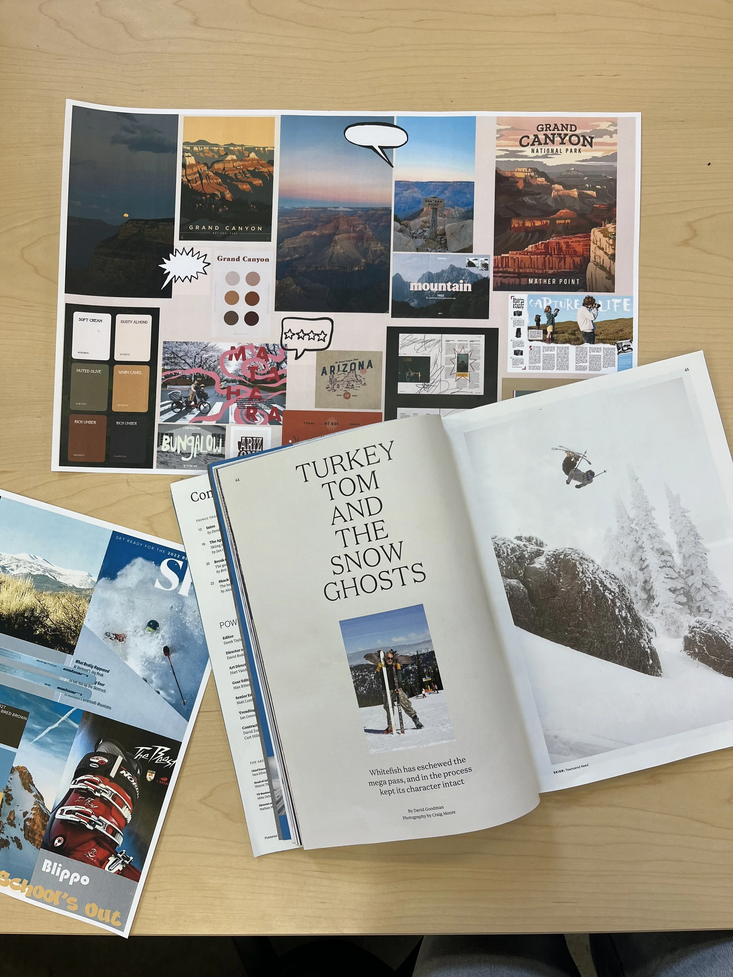 For this project, I redesigned a magazine spread for an article on the surprising opinions of people who think the Grand Canyon isn’t that special. I started with a moldboard with font and layout ideas. I placed the reviews in hand-drawn speech bubbles to add humor. The layout contrasts the vast beauty of the canyon with the blunt comments to create a playful, ironic tone. Through bold hand-drawn typography, composition, and visual contrast, the design invites viewers to reflect on how perspective shapes experience, while also having a bit of fun with the idea.